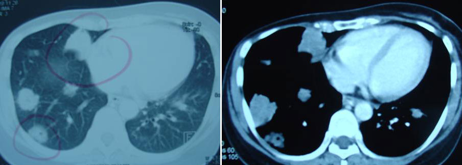 Six months later, 19 August 2008, CT scan indicated pulmonary nodules are increasing in number and measure from 0.5 to 5.0 cm. Subcentimeter mediastinal nodes are also seen.
