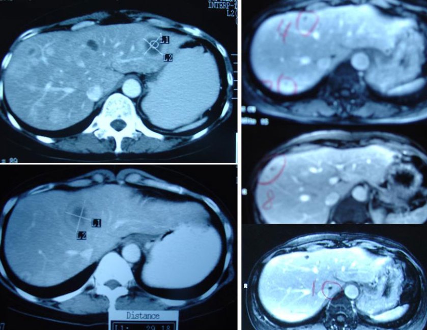 - metastasis in both hepatic lobes. The largest lesion in the left lobe measures 2.0 x 1.8 cm and the largest in the right lobe measures 1.5 x 1.4 cm.