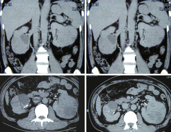 A CT scan done on 16 November 2011 indicated a large mass, 6.7 x 8.4 x 7 cm in size in the left kidney. The right kidney has a nodular mass, 6.6. x 4.9 x 6.4 cm in size. Appearances are highly of bilateral renal neoplasm.