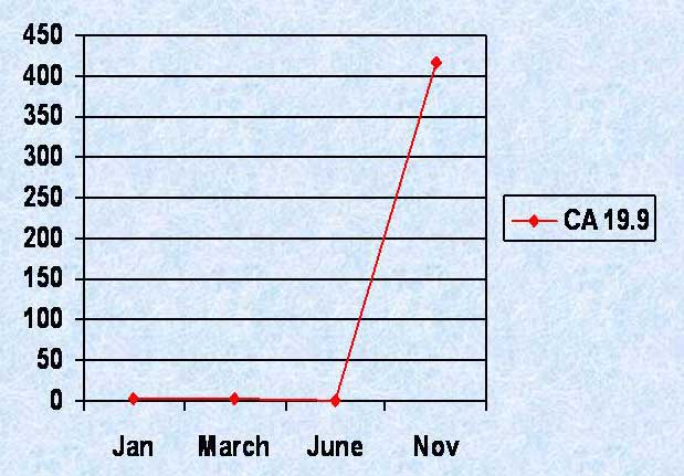 b) Look at the graph. In January, March and June, the CA 19.9 was almost zero. But from June to November, the value had shot up to 417. Why? How could this happen? I asked Tony: Can you tell why? You are a professional. An educated man.