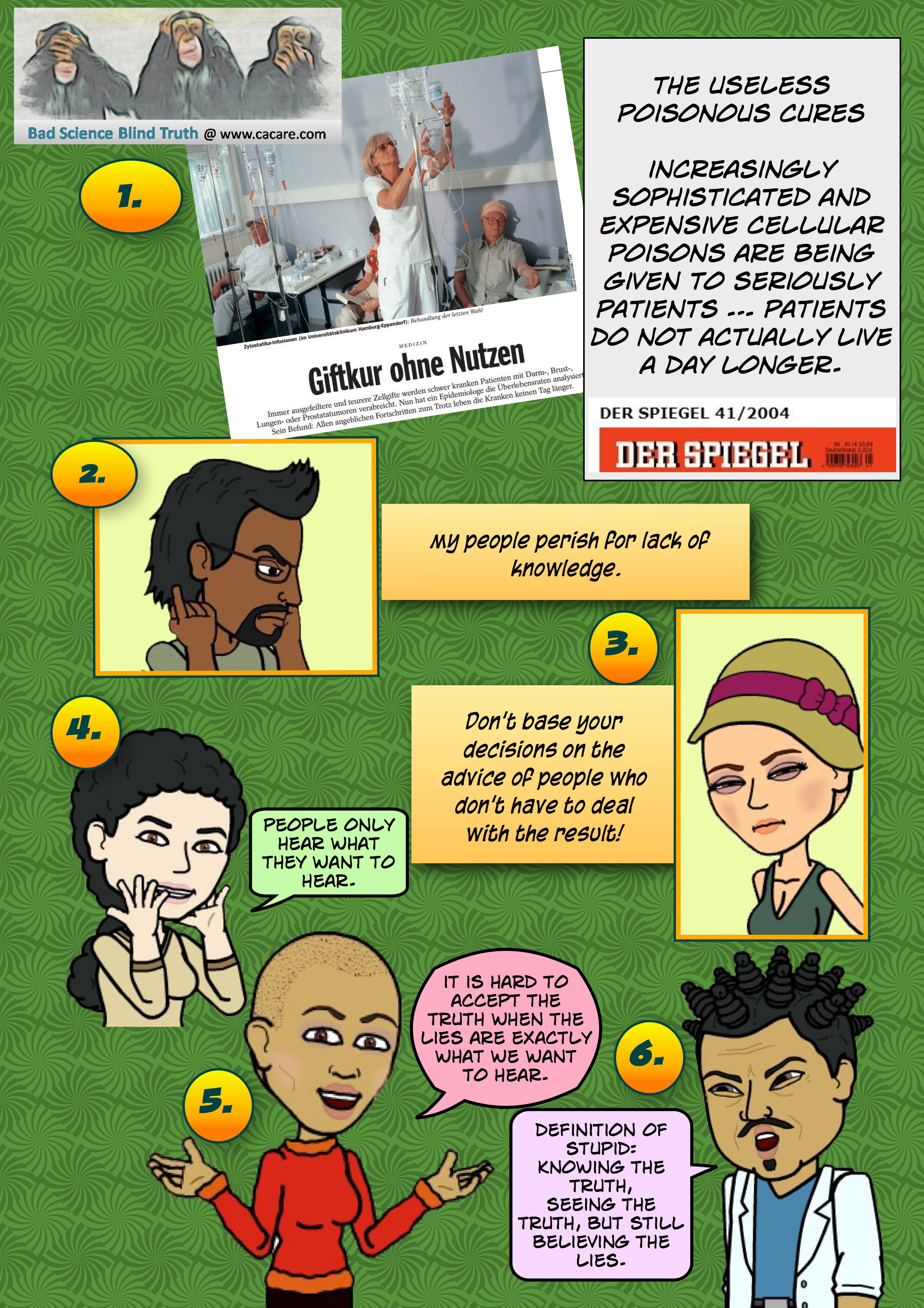 Another story come to mind. Terry (not real name) had recurrence of his lymphoma. His red blood counts were low. According to the doctor it was very dangerous and he must come to the hospital and do something. Talking to Terry, I also knew that he bought up this idea wholesale. But when he was talking to me, me he looked pale but was okay … could walk, talk, no pain, etc. So my advice was to take it easy. If there is no emergency, don’t fix it! Take the herbs and papaya leaf tea and see what happen in the next few weeks. But people generally want quick fix. He went off, landed in a hospital and a week later was dead.