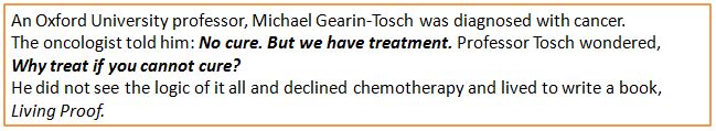 Not too long ago, a friend whose wife had breast cancer was told by a renown oncologist: If you have a million or so, this is the time to spend your money, to show your concern for your wife. But the big question is, Can the treatment cure her? The answer is NO. My friend told me, It was a disgusting advice! We never went to him again.