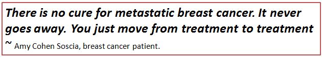 I learned about Amy Cohen Soscia from the internet. She had breast cancer when she was 43-years old. Amy underwent a mastectomy, reconstructive surgery, chemotherapy and radiotherapy. She received treatments in one of the world’s outstanding cancer hospitals in the United States. In spite of the aggressive treatment, Amy’s cancer spread to her liver and spine. She also received Herceptin. The cancer spread to her brain. More chemo drugs and radiation but these did not help her. Before she died, she wrote: