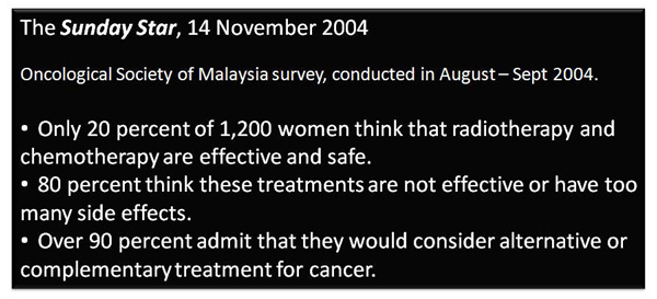- TA told us that a relative in Palembang (Indonesia) also had breast cancer. This was after she (TA) was diagnosed with breast cancer. She shared her healing journey with this relative but unfortunately the patient’s husband did not believe in alternative medicine. This relative had 7 cycles of chemotherapy. After the 6th cycles, she was totally “down.” TA asked her to stop the treatment but her advise was ignored. After the 7th cycle, she went into coma and died. She died less than a year after her diagnosis.