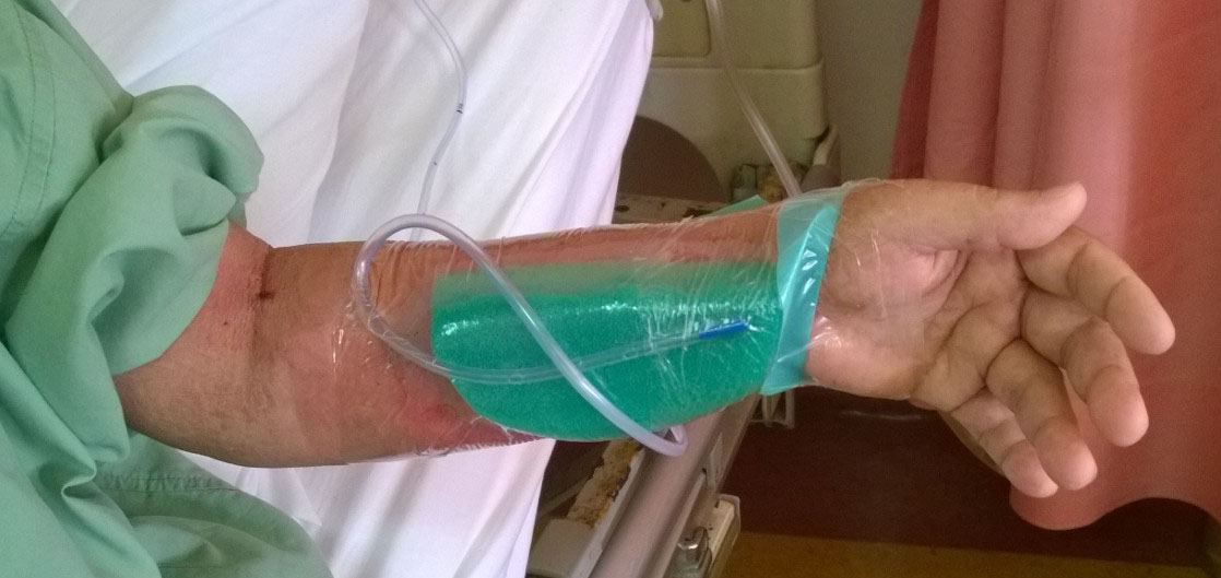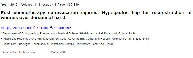 At our center over 3-years period, 32 patients were treated for chemotherapy extravasation wounds. Out of these 32 patients, seven had wound over dorsum of hand. Two patients were treated with chemotherapy for carcinoma lung. Other patients were of Non-Hodgkin’s lymphoma, Osteosarcoma, Breast carcinoma, Oropharanyx carcinoma, and Brain tumor.