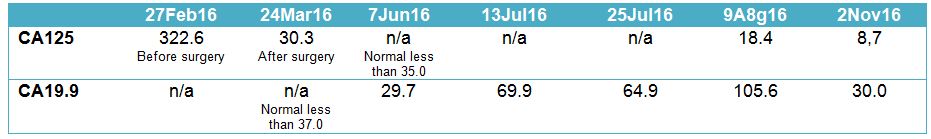 On 9 August 2016, her CA 19.9 was at 105.6 and after taking the herbs, on 2 November 2016, her CA 19.9 was 30.0 (within normal range).