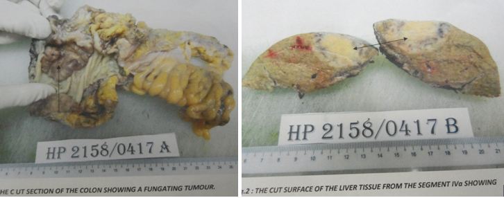 • A moderately differentiated adeocarcinoma with metastases in pericolic lymph nodes (11/11) and segment 4a of liver. This was a T3N2Mx, Stage 4 cancer.