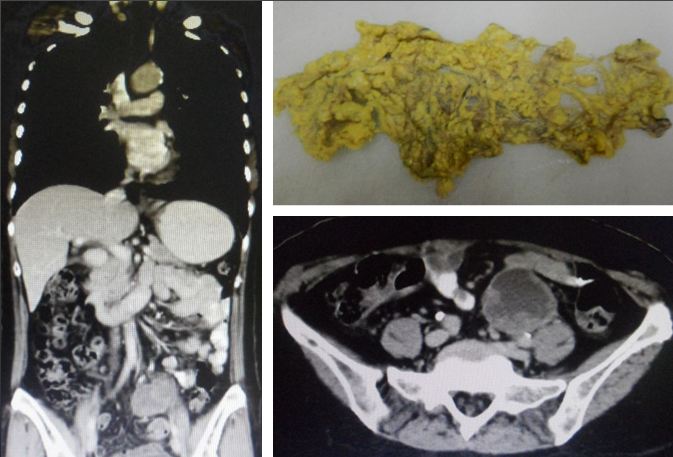 - Heterogenous lobulated mass in the left pelvis measuring 4.9 x 4.5 cm seen abetting the adjacent bowel loops.