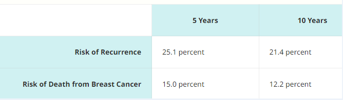 - If you take tamoxifen for 5 years the risk of recurrence was 25.1% but if you take tamoxifen for 10 years the risk of recurrence is 21.4%. So additional benefit of taking tamoxifen for another 5 years is only 3.7%.