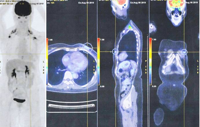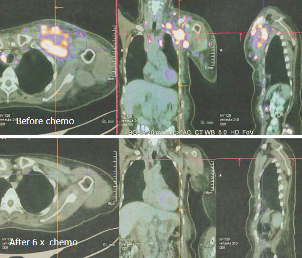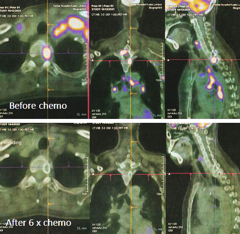 Doctor said this Monday will do CT scan to compare with the 1st CT scan. His face tumor size reduce 68.7%. His lungs tumor size smaller than that day. Kidney tumor smaller than that day. Blood test results – everything normal. But still need to take bone marrow to check when he ok