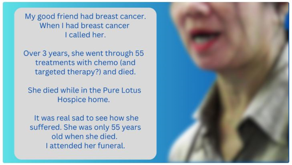 To be honest, this sad news came as no surprise. When you have metastatic cancer, we know that there is no cure. There will be a day when we need to accept that death will come. That is the final cure for cancer. But while we are still alive, let us pray that there is no suffering and we go in peace. This is the message I would like to share with you.