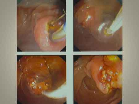 An expandable metal biliary stent (8 cm x 10 mm) was inserted at the common bile duct.