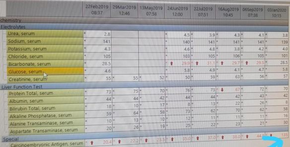 Professor, we manage to take the result from PATH LAB today. The numbers on tumor markers were worrisome. The latest result shows the CEA spike to 11 from previous 5.5 while CA 19.9 increases to 55.2 from previous 19.