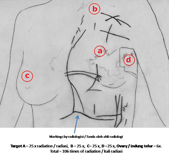 Are you sure? Is that correct? Le: Sure, correct. I received 25 treatments on my left breast (a), then another 25 times below my collarbone (b). Another lump appeared on my right breast and I again had 25 treatments for my right breast (c). Then they radiated my ovaries – that was done for six times. The cancer spread again to my left breast and I again had 25 treatments (d). Actually I have just completed the 106th treatment a few days ago. Then I came here.