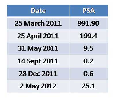 CN was subsequently treated with Lucrin injection (RM 1,300 per month per injection). He also took the oral drug, Casodex (RM 21 per tablet /day). The treatment brought down his PSA level from the initial level of 991 to 0.2 within six months. Unfortunately, after six months, the PSA started to rise again from 0.2 to 25.1 in May 2012 (Table below).