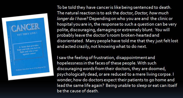 About a week ago I received an email from someone in Penang. The writer wanted to bring her 65-year-old mother for surgery or/and chemo, in spite of extensive cancer in her live. There was also cancer in her bones.