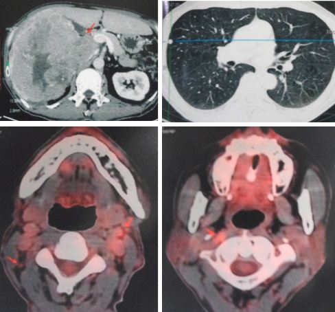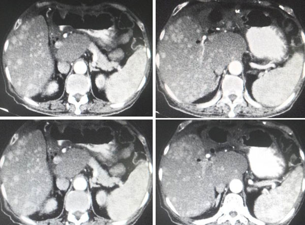 2. About 9 months later, the cancer recurred. The tumour in his liver is now about 8 cm in size. The cancer had also spread to his lungs.