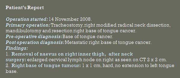 I underwent a major operation – radical neck resection, in November 2008. The cancer was at the base of my tongue but it had already spread to the lymph nodes. All these were removed. The doctor said it was already a stage four cancer.
