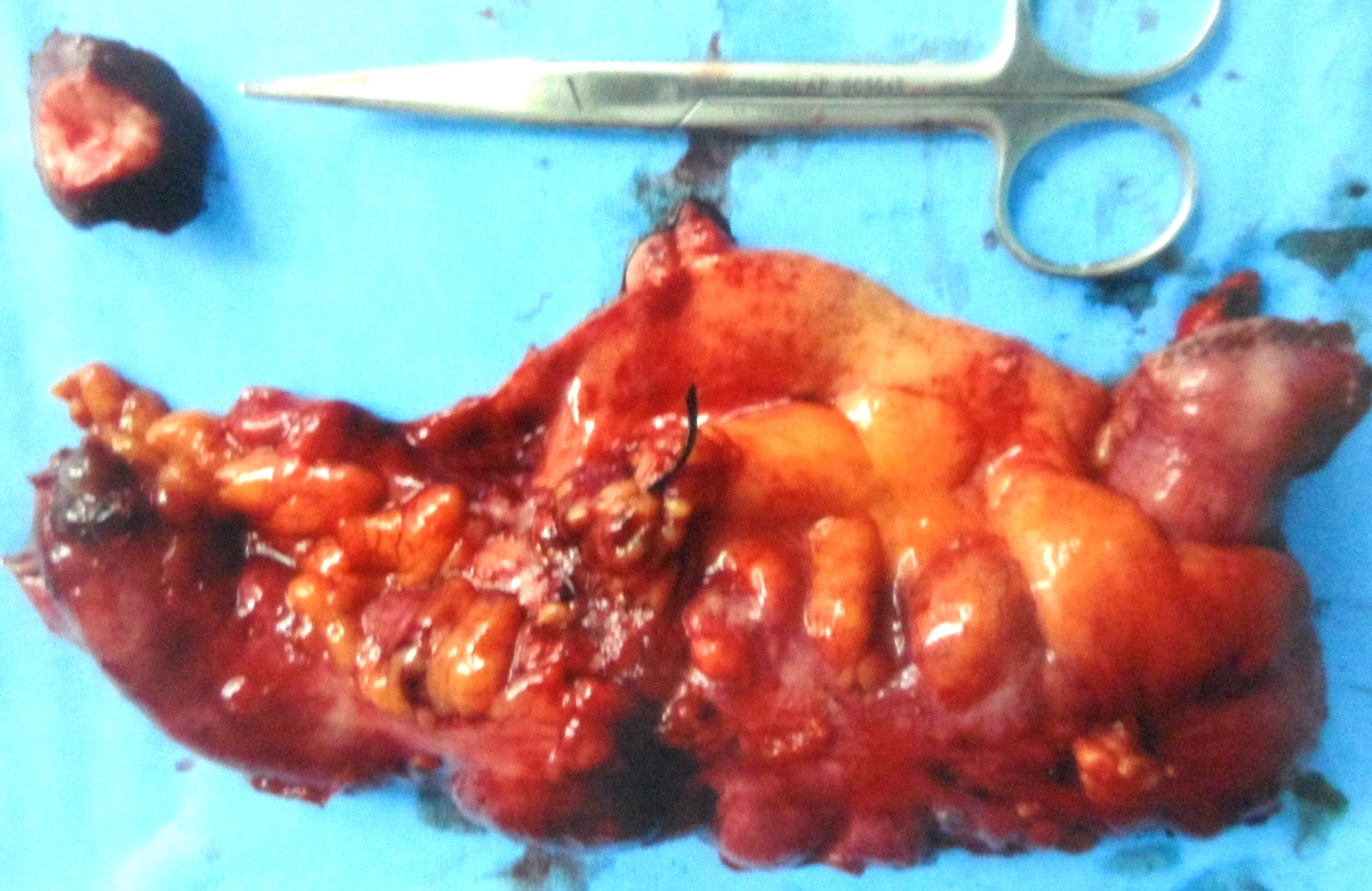 • There is pericolonic tumour infiltration and the lymph nodes are mildly enlarged.